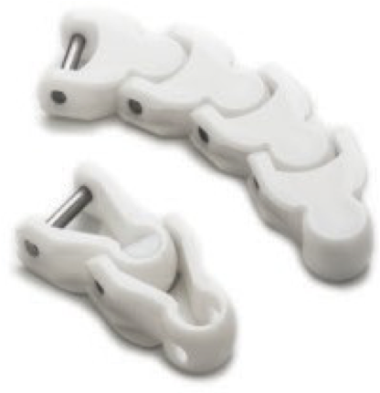Dit zijn kunststof radius kettingen met een steek van 50 mm. Net als de ketting zijn ook de pennen in diverse materiaal kwaliteiten leverbaar. Naast de standaard leverbaar in TAB en BEVEL uitvoering en te voorzien van meenemers "PEGS".